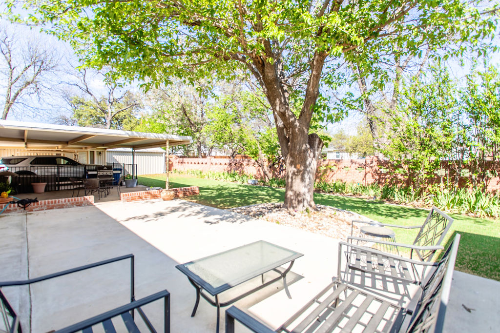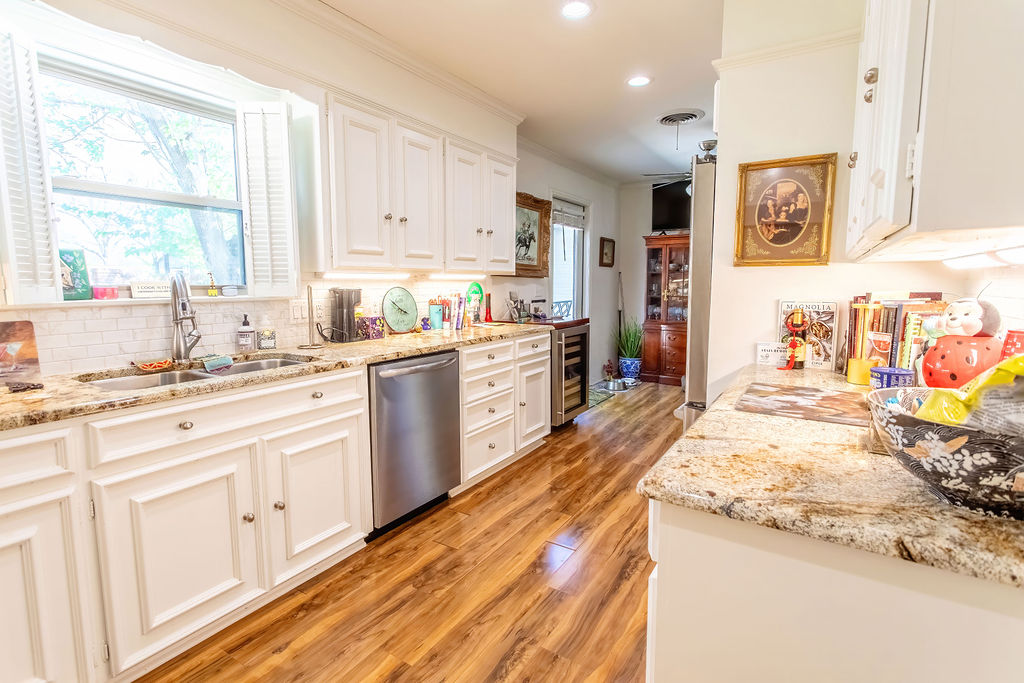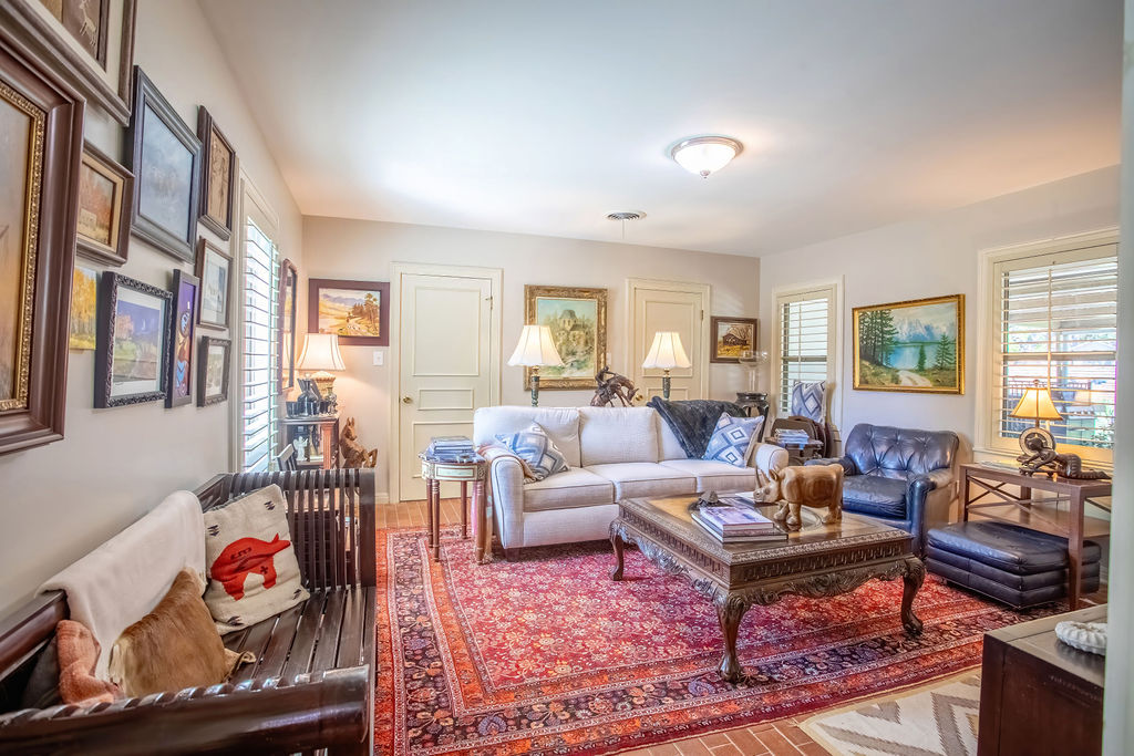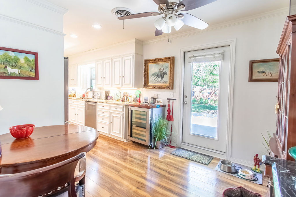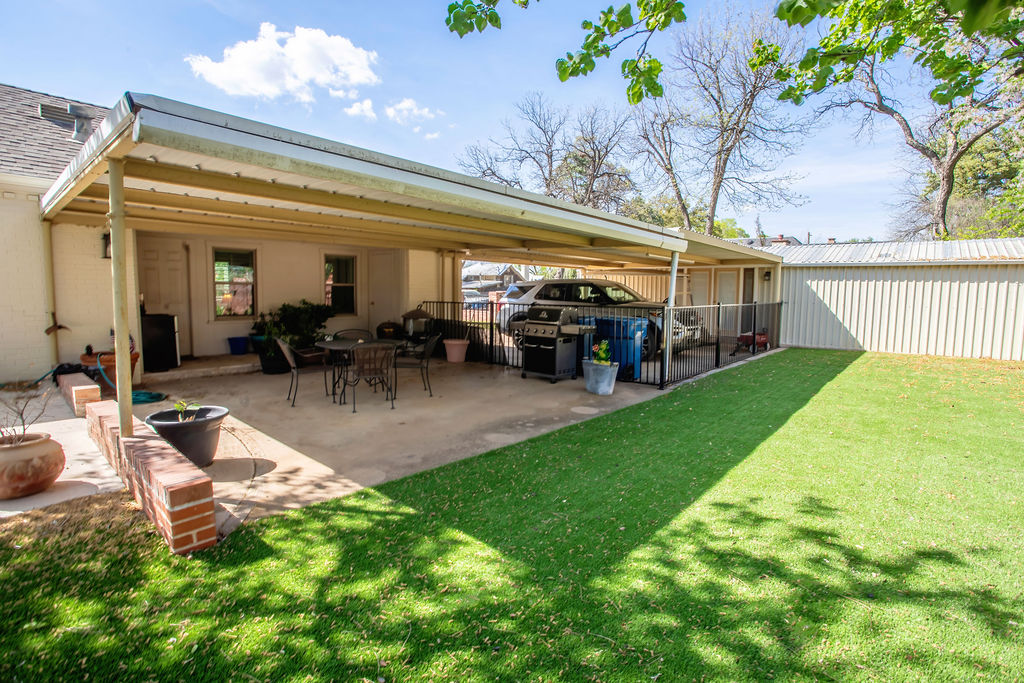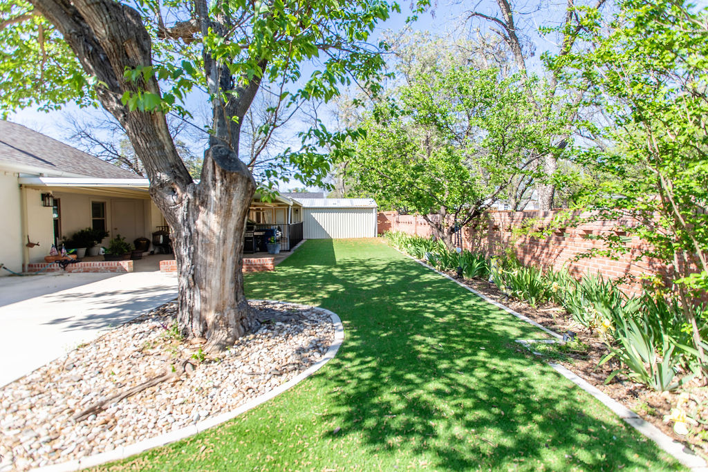 Beautiful and well-constructed home in a desirable neighborhood in Albany, TX. This residence features 2 to 3 spacious bedrooms, 3½ bathrooms, a fireplace, and a kitchen equipped with high-end appliances. It seamlessly blends original charm—such as brick flooring, wide crown molding, and classic paint hues—with contemporary updates, including a modernized kitchen and new windows throughout. The master suite includes a large En-suite bathroom, offering a level of space rarely seen. Ample closet and storage options are available throughout the home. The backyard is perfect for hosting family and friends, featuring easy-to-maintain artificial turf with tree-shaded and covered patio areas for entertaining. A spacious 552 sq ft. finished out metal storage building equipped with built-in cabinetry and two mini-split air conditioning units, which provide a flexible space, suitable for an office, music room, craft room, or additional guest quarters.